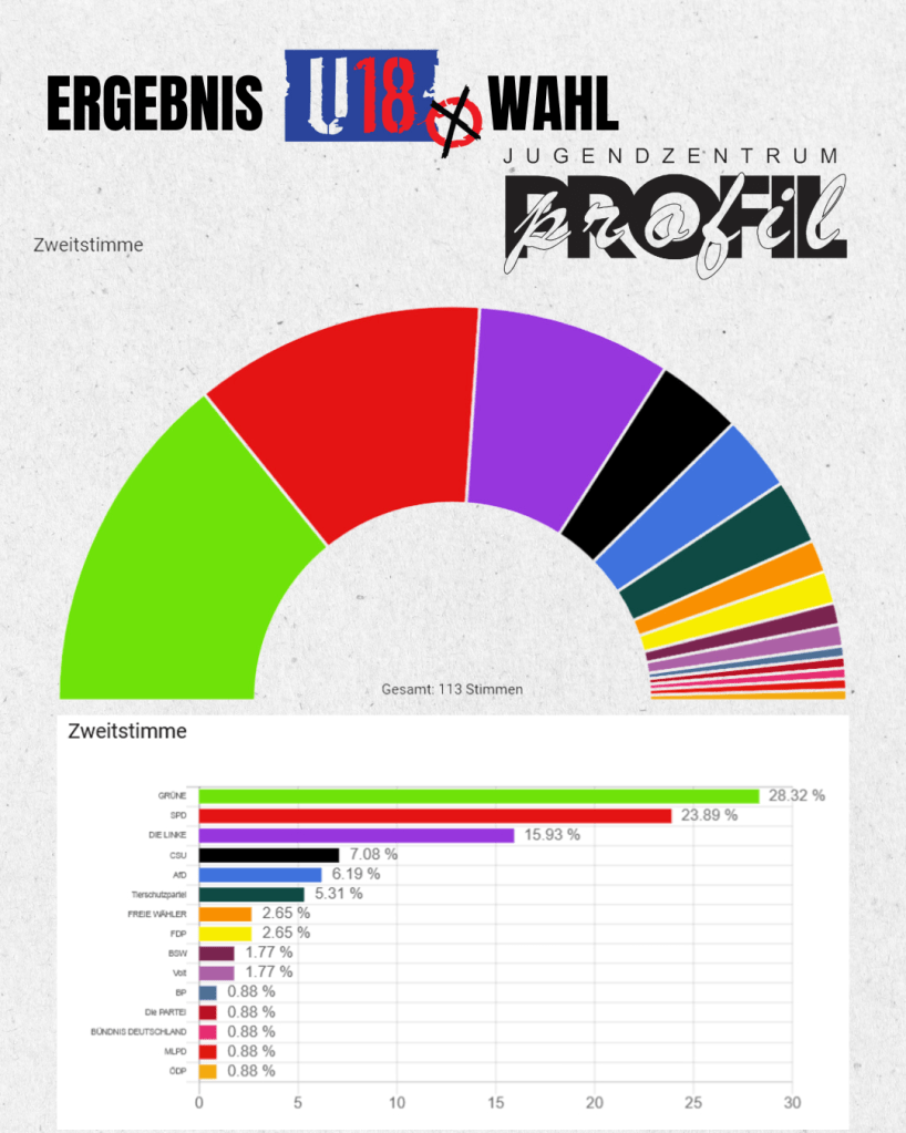 Am 12. & 13.02.2025 fand im Jugendzentrum PROFIL die U18-Wahl zur Bundestagswahl 2025 statt. Unterstützt wurden wir hierbei von den Kolleginnen der KJSA des WHG und der Max Mannheimer Mittelschule.