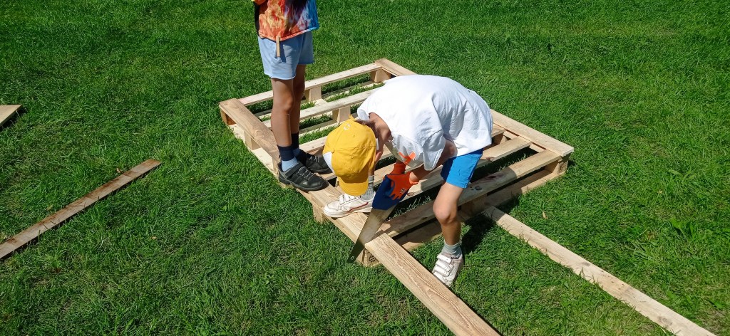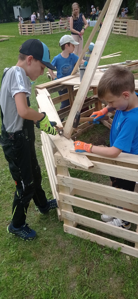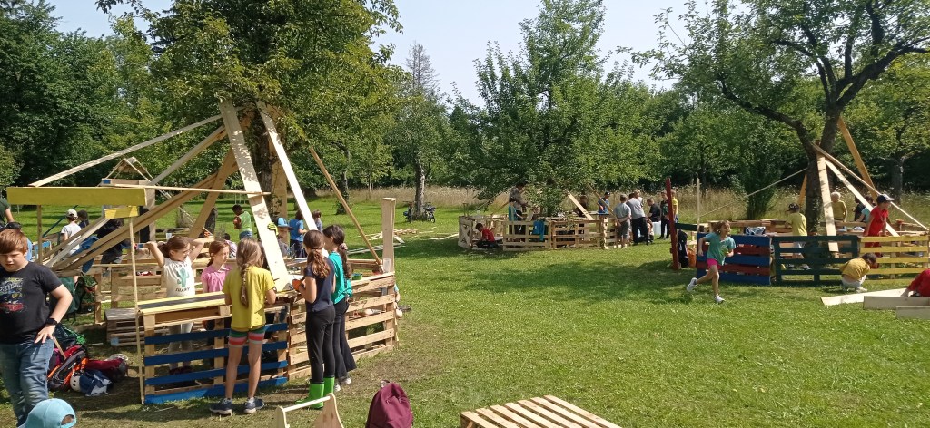 Die Kinder verwandelten die Obstwiese in eine Superhelden-Metropole. Es wurde gesägt, gehämmert und bunt bemalt. So entstanden fantasievolle Hütten, die als Hauptquartiere, Geheimverstecke und Trainingslager für die