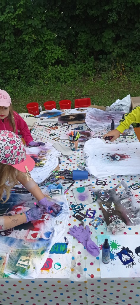 In vielfältigen Workshops konnten die Kinder ihre Kräfte erproben und ihre Kreativität entfalten. Sie entwarfen eigene Superheld*innen-Buttons, wurden zu Spion*innen ausgebildet, konnten T-Shirts designen, Boote basteln und auf dem Mühlbach schippern lassen.