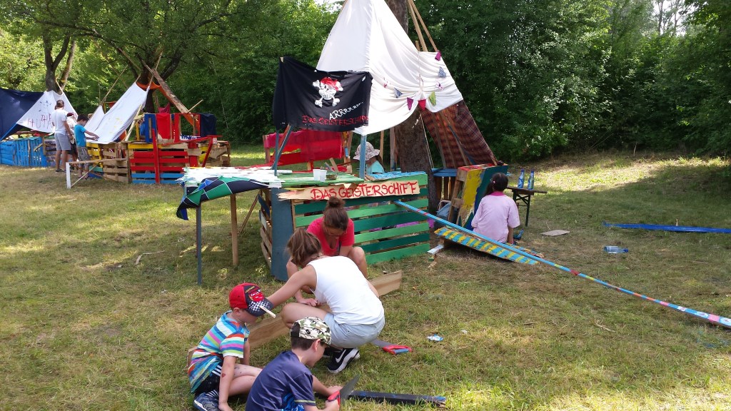 Eines dieser Projekte ist der Aktivspielplatz. Alljährlich brechen bis zu 90 Kinder im Alter zwischen sechs und elf Jahren in der ersten Sommerferienwoche auf eine Reise in eine Phantasiewelt im Obstgarten auf, um diese Welt hier selbst zu bauen. Betreut werden sie dabei von ehrenamtlich tätigen Jugendlichen und den Pädagog*innen aller Garchinger KJR-Einrichtungen.
